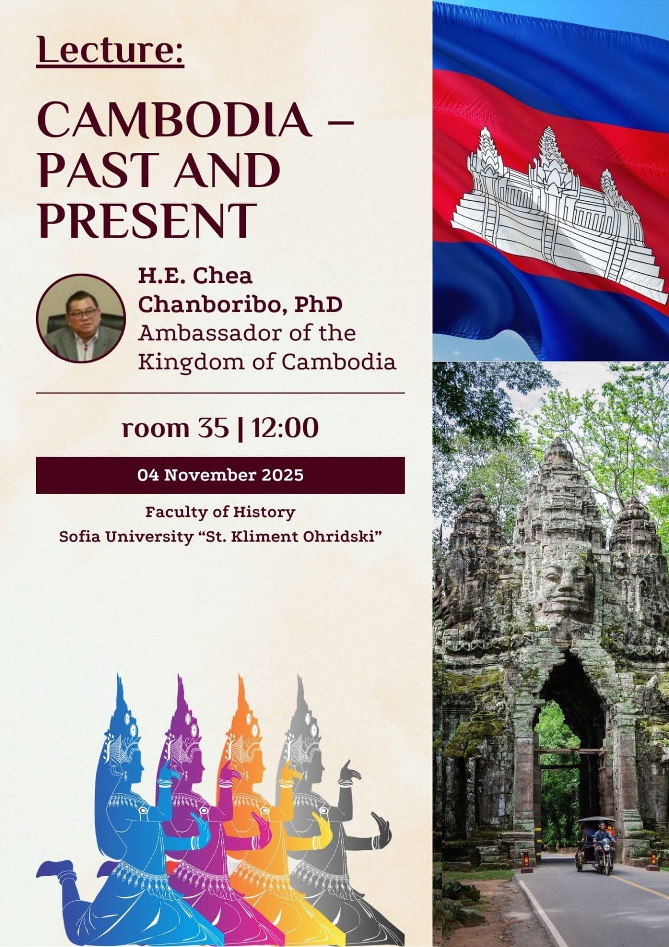 На 04.11.2025 г. (ауд. 35, 12:00 ч.) Негово превъзходителство посланикът на Кралство Камбоджа – д-р Чеа Чанборибо ще изнесе лекция на тема “Камбоджа – минало и настояще”.