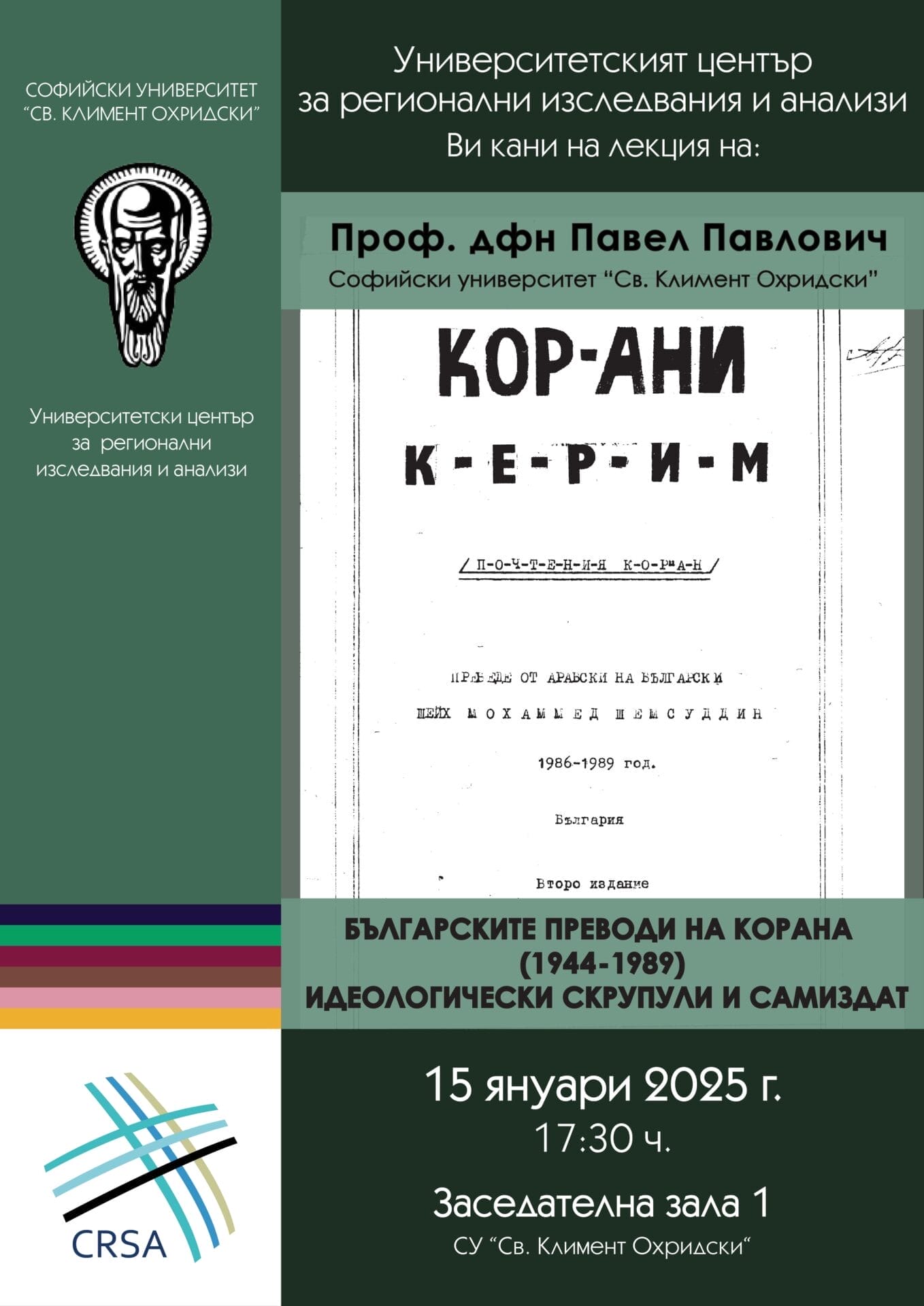 Университетският център за регионални изследвания и анализи има удоволствието да Ви покани на публичната лекция на проф. дфн Павел Павлович на тема: “Българските преводи на Корана (1944-1989). Идеологически скрупули и самиздат”.