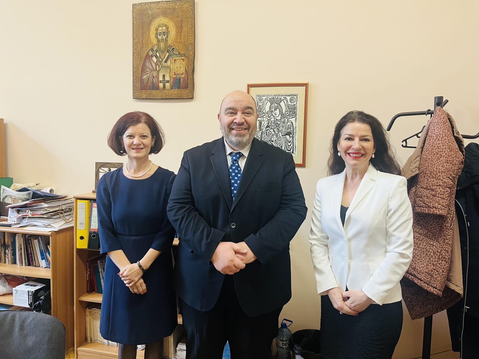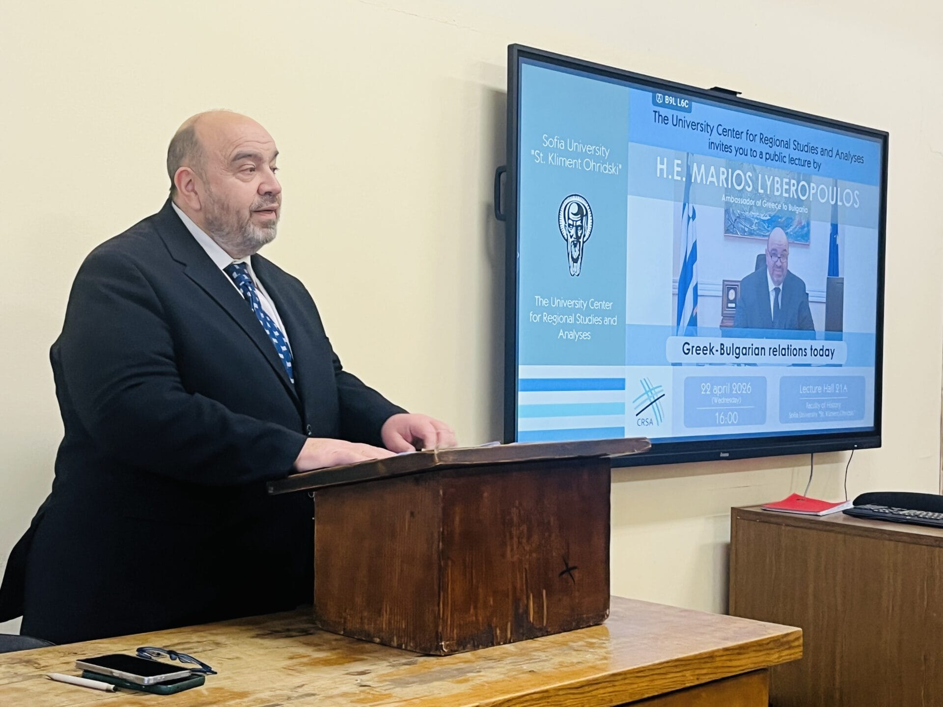 Деканът на Историческия факултет проф. Мира Маркова и председателят на Общото събрание на ИФ проф. Румяна Христиди проведоха среща с посланика на Република Гърция Н. Пр. Мариос Либеропулос, на която обсъдиха отличното академично сътрудничество с гръцки университети, както и възможностите за разширяване на контактите и бъдещи съвместни инициативи. След това посланик Либеропулос изнесе публична лекция пред студентите от Факултета на тема “България и Гърция днес” по покана на Университетския център за регионални изследвания и анализи.